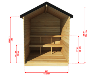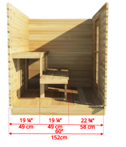 The two-tier seating layout inside this cedar wood sauna provides enough room for 2 to 3 people. You can place a wood-burning or electric heater inside this Dundalk Leisurecraft Granby Sauna, to the side next to the seating to prepare a comfortable setup. the vents on the sides will allow air to circulate well, in this Dundalk Granby cabin sauna.